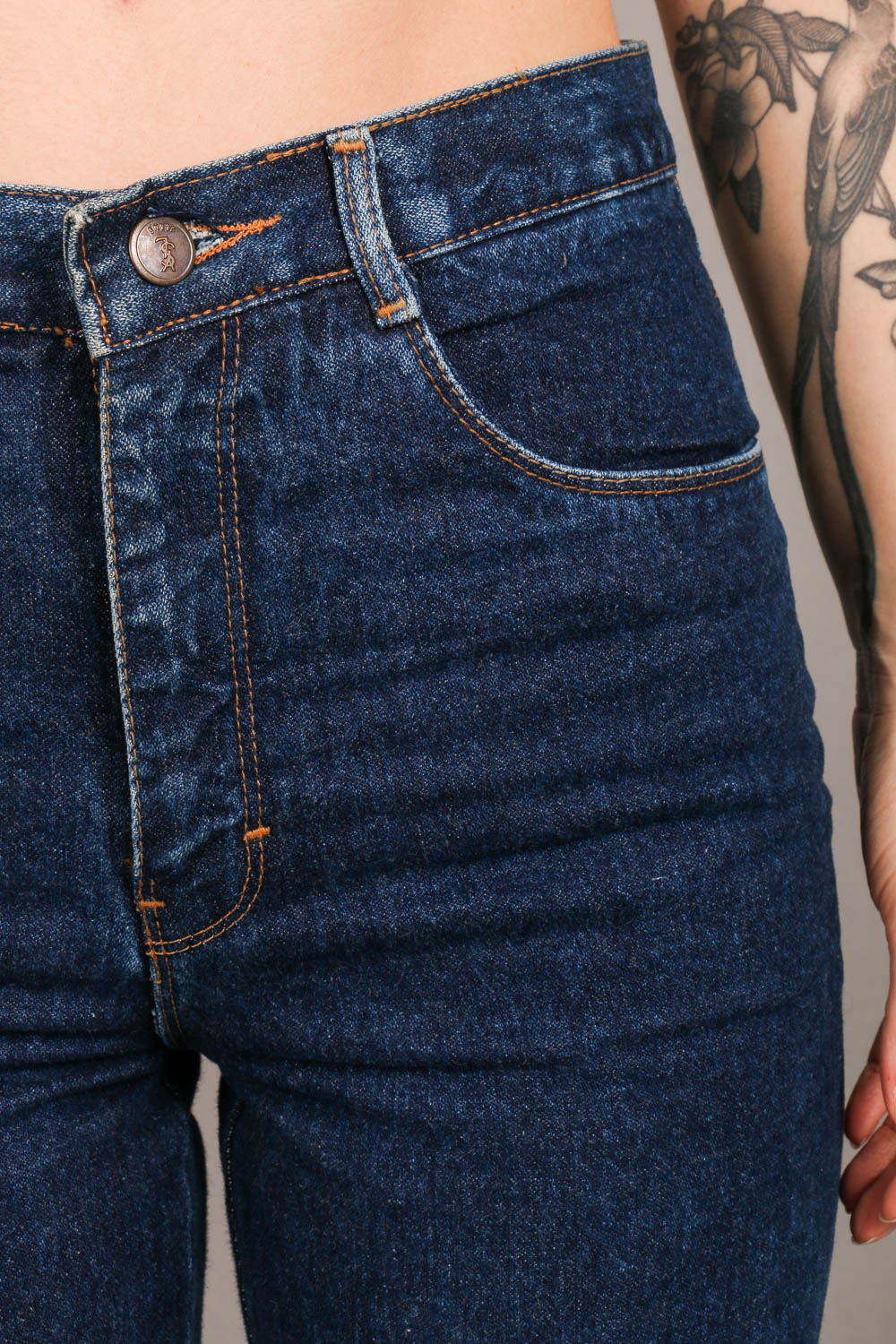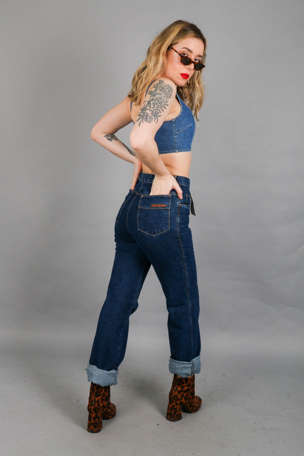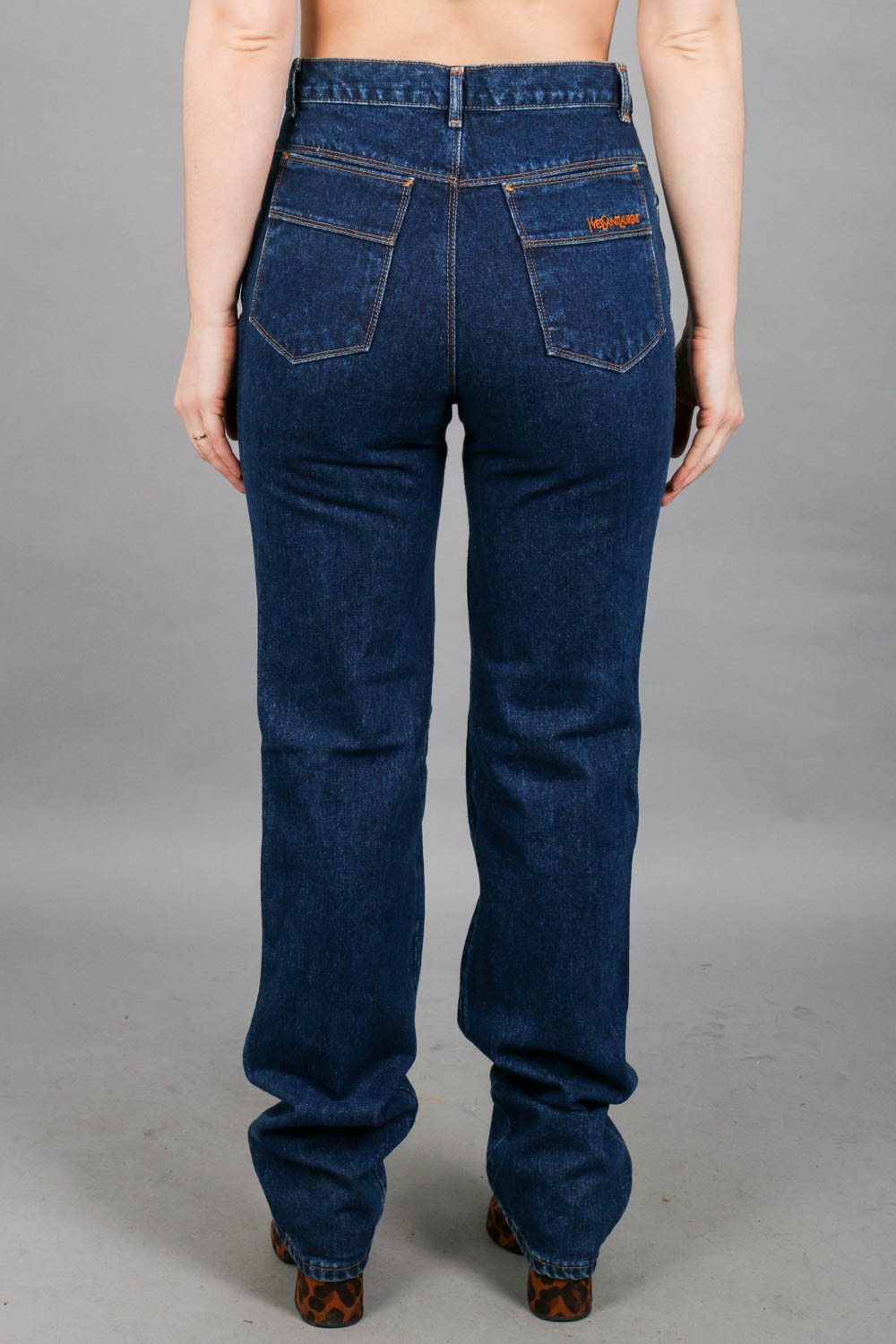 Essa calça original Yves Saint Laurent vai fazer seu coração bater mais forte! Com a cintura super alta, lavagem mais escura, e um bordado lindo da marca no bolso traseiro. É ou não é perfeita? E tem mais: essa é uma peça vintage de carteirinha, original dos anos 80, que ficou guardada até pouco tempo em uma loja da cidade de São Paulo, SP. Chegou até a gente após todos esses anos por meio da Juliana, que nos recebeu por lá e contou toda a história. É uma peça legítima da marca e, pasmem, nunca usada! Tem cintura super alta e pernas retas, e uma tonalidade jeans bem escuro que é um luxo. Por se tratar de uma peça bem antiga, pode apresentar algumas marquinhas do tempo. Pra gente, isso só traz mais originalidade à peça. Um verdadeiro achado!