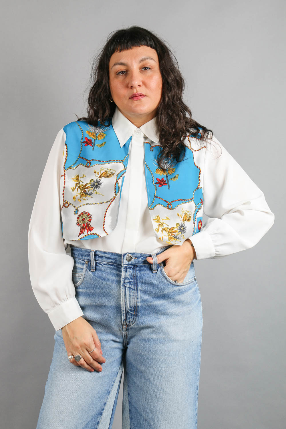 Camisa vintage é tudo que a gente quer! Essa aqui é lindíssima, todinha branca e conta com uma sobreposição em tecido estampado floral azul, o que dá um charme único e especial para essa peça linda, que só pode ser vintage! Possui modelagem reta, gola tradicional, abotoação no punho e fechamento por 6 botões. A camisa tá um arraso, só esperando para ser sua! Ela está sem etiqueta de tamanho, por isso, recomendamos conferir as medidas no final da página para não restarem dúvidas, e a modelo que fotografou a peça veste normalmente G.
