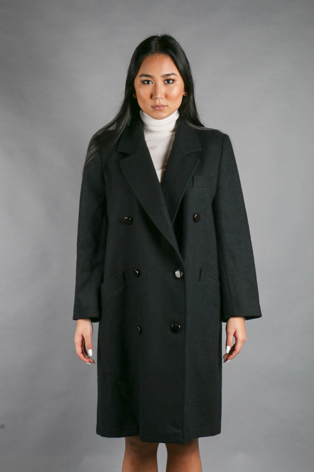 Se você estava buscando por um casaco único e exclusivo para a vida todinha, acabou de encontrar! Essa relíquia é um casaco de lã batida no tom mais clássico e atemporal que existe: preto, o que toda garimpete precisa ter no guarda roupa! Garimpamos esse tesouro em Buenos Aires, e ele impressiona pela qualidade da sua lã e de seu corte impecável. Com modelagem reta e ampla, tem estilo oversized e fica super estiloso em qualquer look! Possui fechamento transversal por seis botões, além de ter um botão em cada punho. Tem ombreiras, três bolsos externos e gola tradicional. A peça é todinha forrada e está em ótimo estado. É aquela relíquia que vai te acompanhar por muitos e muitos invernos, e passar por gerações!