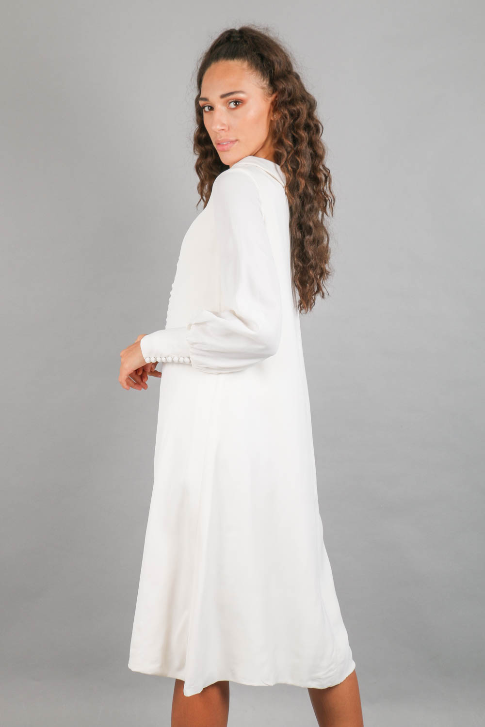 Esse vestido é mais uma relíquia perfeita que garimpamos! Ele possui mangas longas e bufantes, com punho largo. Gola redonda, modelagem em A, com comprimento midi. A peça é toda forrada e tem fechamento por 56 botões lindíssimos forrados, que também aparecem no punho e, quando fechados, produzem um efeito bufante lindo. Os acabamentos da peça são super delicados e minuciosos, o que deixa claro que essa é mais uma daquelas peças feitas sob medida, para uma ocasião super especial. O sonho de princesa de qualquer brechozeira! Por ser uma peça bem antiga, possui algumas marquinhas do tempo, mas nada que atrapalhe o uso da peça. Um botão forrado acabou caindo da peça bem na hora da foto, mas, ele será consertado antes de enviarmos essa relíquia para você!